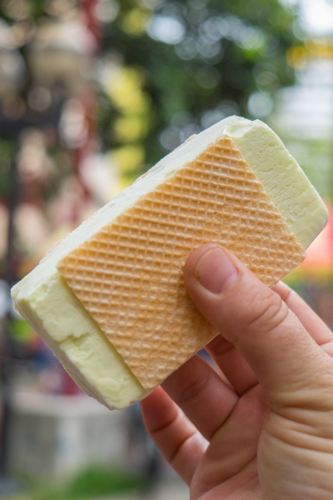 A brick of ice cream served wrapped up in a slice of bread, wafer or just in a cup.