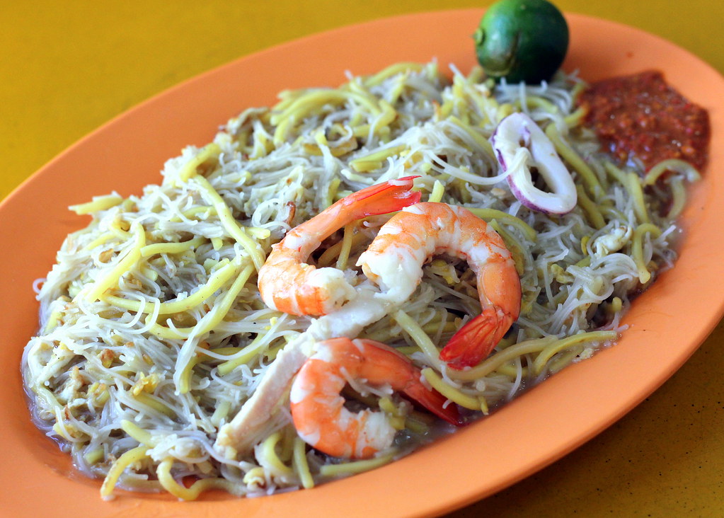 Also known as fried prawn noodles, this stir-fried noodle dish is steeped in aromatic stock made of pork bones and prawn heads. It comprises of yellow noodles and thick ‘bee hoon’ (vermicelli)—has juicy prawns, squid, pork belly strips, egg and crunchy fried pork lard (optional). It is served with sambal chilli and a squeeze of lime juice
