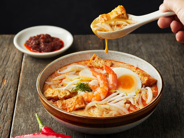 Spicy noodle soup consisting of thick wheat noodles or rice vermicelli with chicken, prawn or fish, served in spicy soup based on either rich and spicy curry coconut milk or on sour asam.