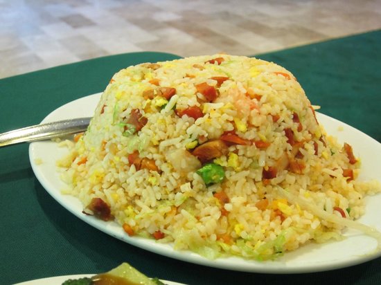 Seasoned rice (cooked in chicken stock) with poached chicken and cucumber garnishes. Usually served with chilli sauce.