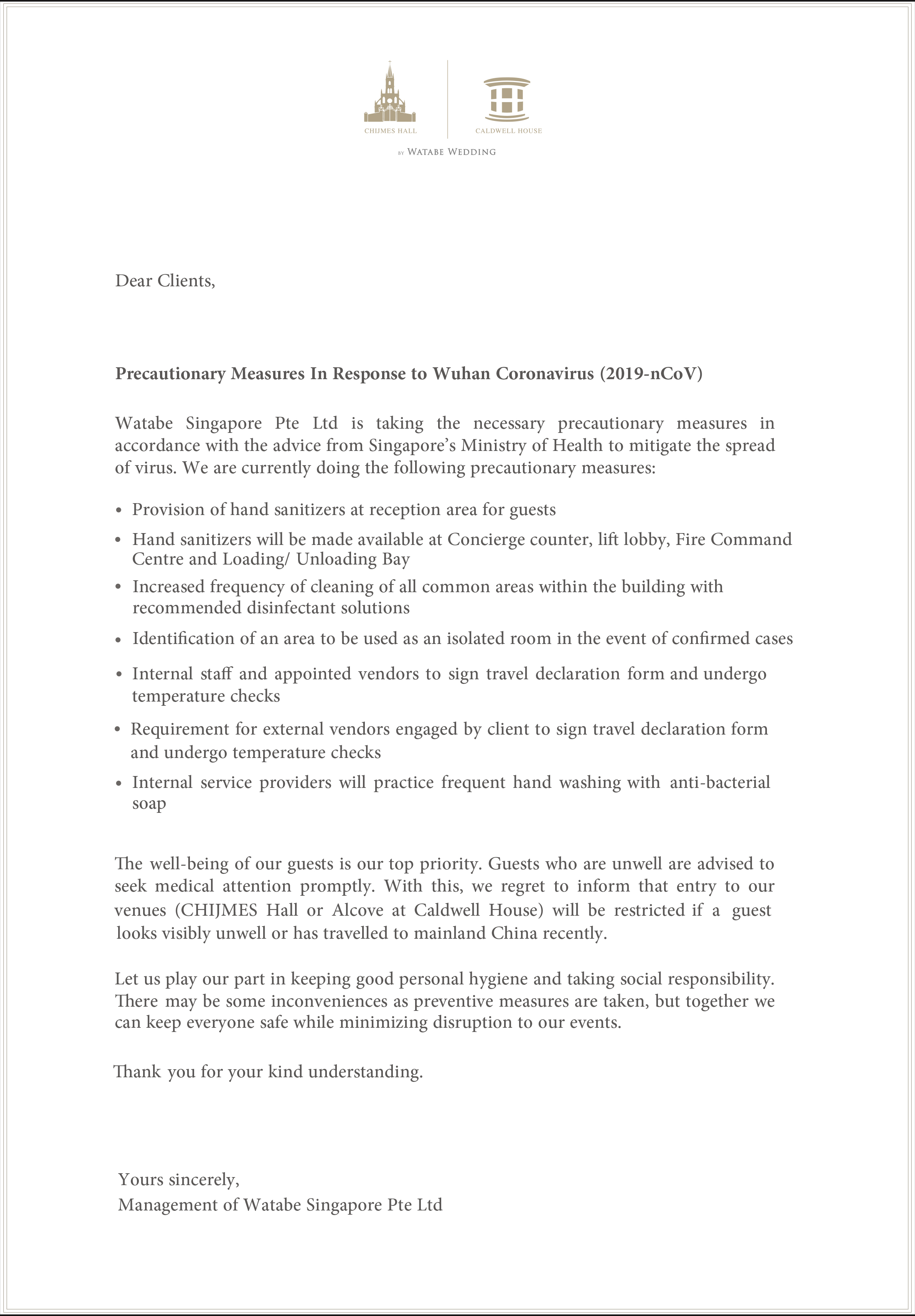 In light of the evolving Wuhan Coronavirus (2019-nCov) situation, Watabe Singapore Pte Ltd (or Chijmes, our venue and caterer) is taking the necessary precautionary measures in accordance with the advice from Singapore’s Ministry of Health to mitigate the spread of virus.